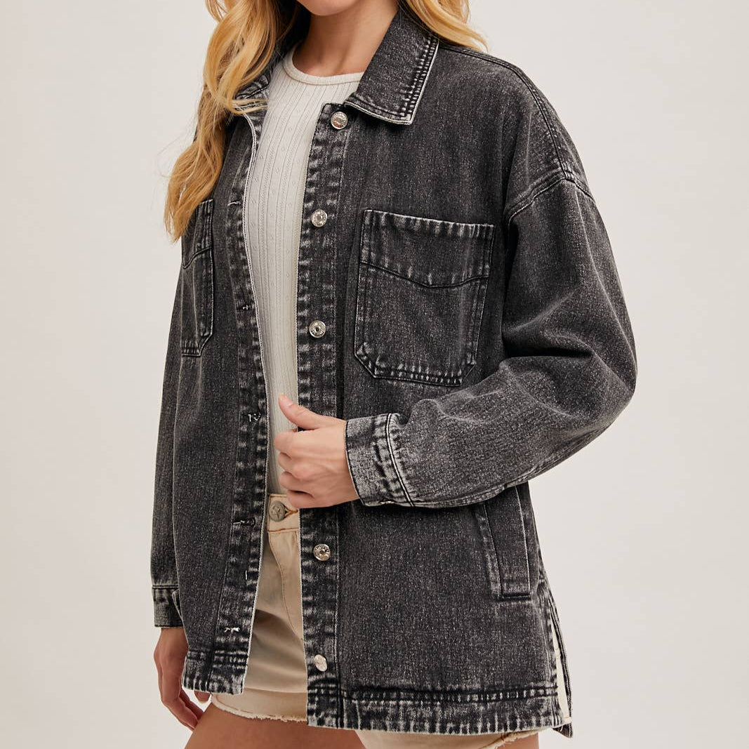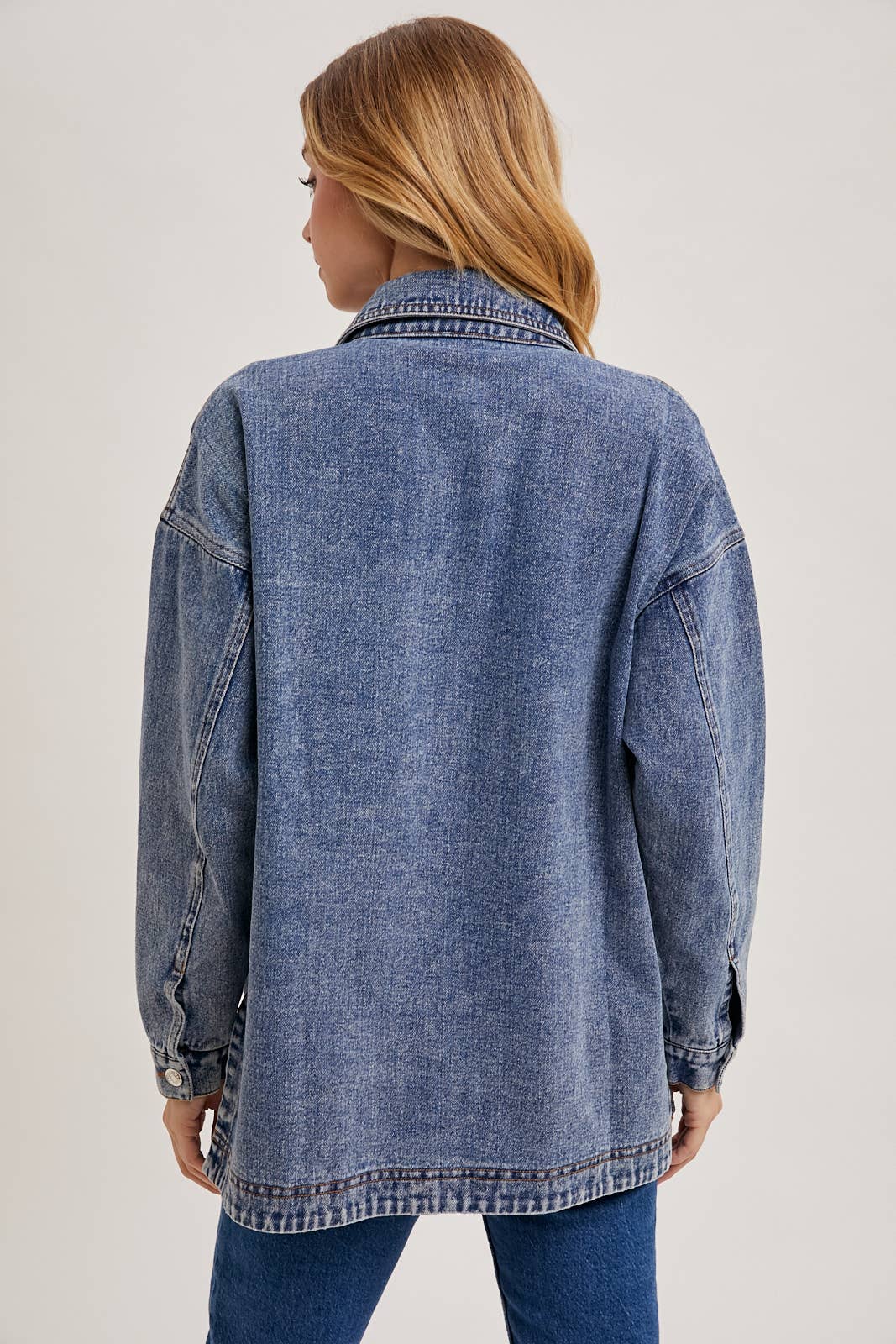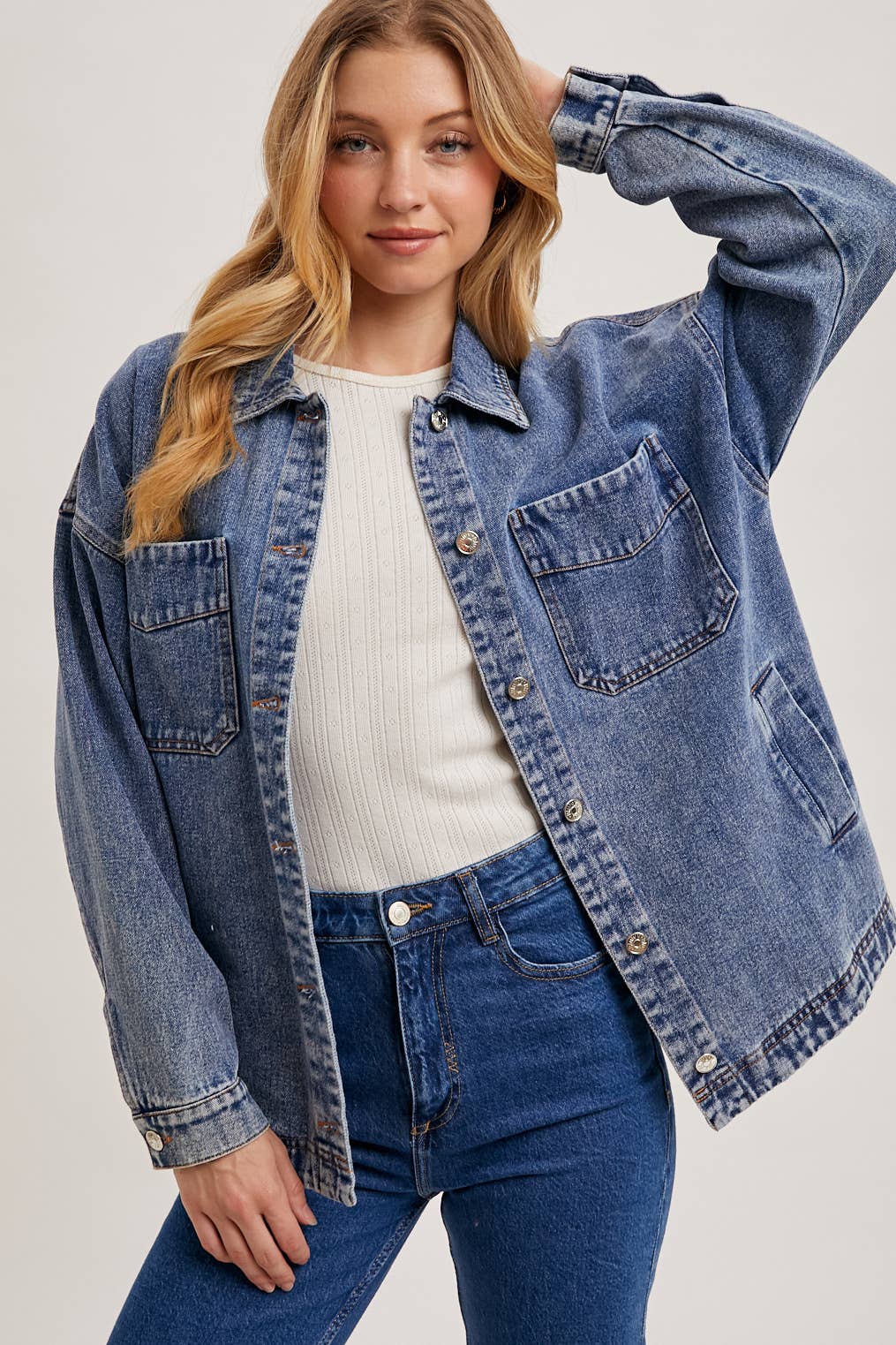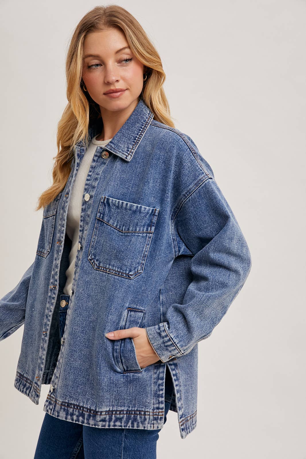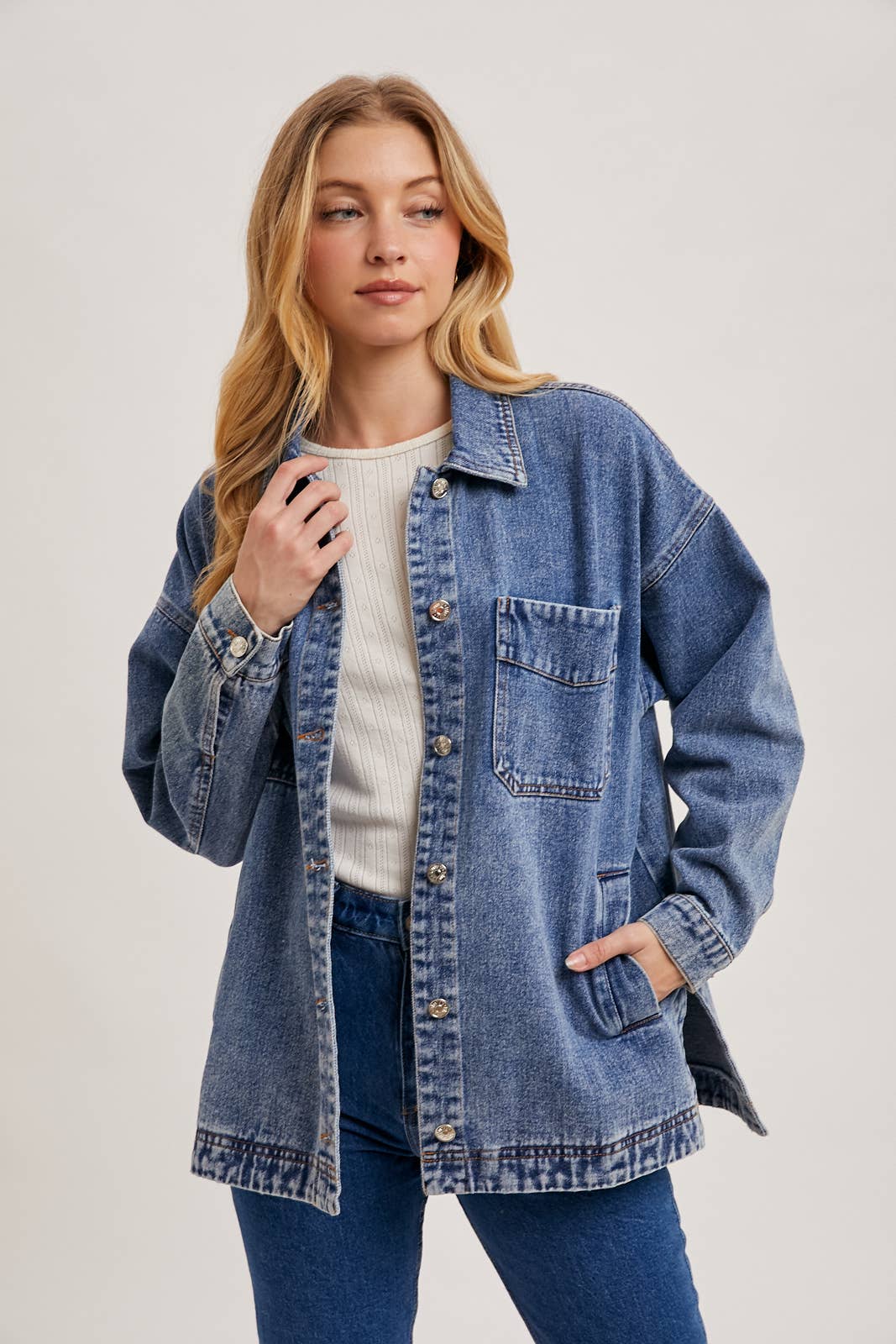 The button-down shirt denim jacket with pockets combines the casual appeal of a denim jacket with the classic look of a button-down shirt. This versatile piece features a full button-down front, allowing it to be worn open or closed, depending on your style. The jacket is crafted from durable denim, offering both comfort and durability. This jacket is perfect for layering over casual outfits or adding a touch of edge to more polished looks. -Model is 5'9" and wearing a Small