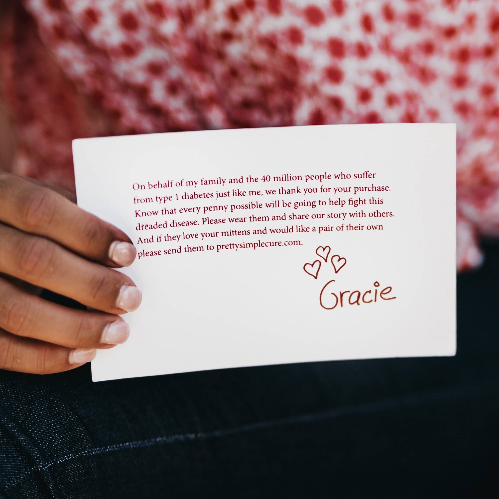 CURE was created out of love. Desperate, helpless, hopeful love. It was created out of that kind of love where you say you would give anything to switch places with your child, love. It was created out of that kind of love where you do whatever it takes to find a CURE, love. With the grace of God and your help we will find a CURE for Type 1 Diabetes, one set of mittens at a time. $5 per pair is donated back to type 1 non-profits. Learn more by watching our video here: prettysimplecure.com. • Colorful, cozy, hand knit mittens • 100% acrylic yarn • Fleece lining Mittens are packaged in a reusable canister that can be used as a piggy bank. We hope you will continue collecting your spare change as an ongoing donation to help find a cure for type 1 diabetes or share it with someone else in need. Small: Toddler - 6/7 years Medium: 6/7 years - large youth or XS adult hand Large: Most popular for teens and adults