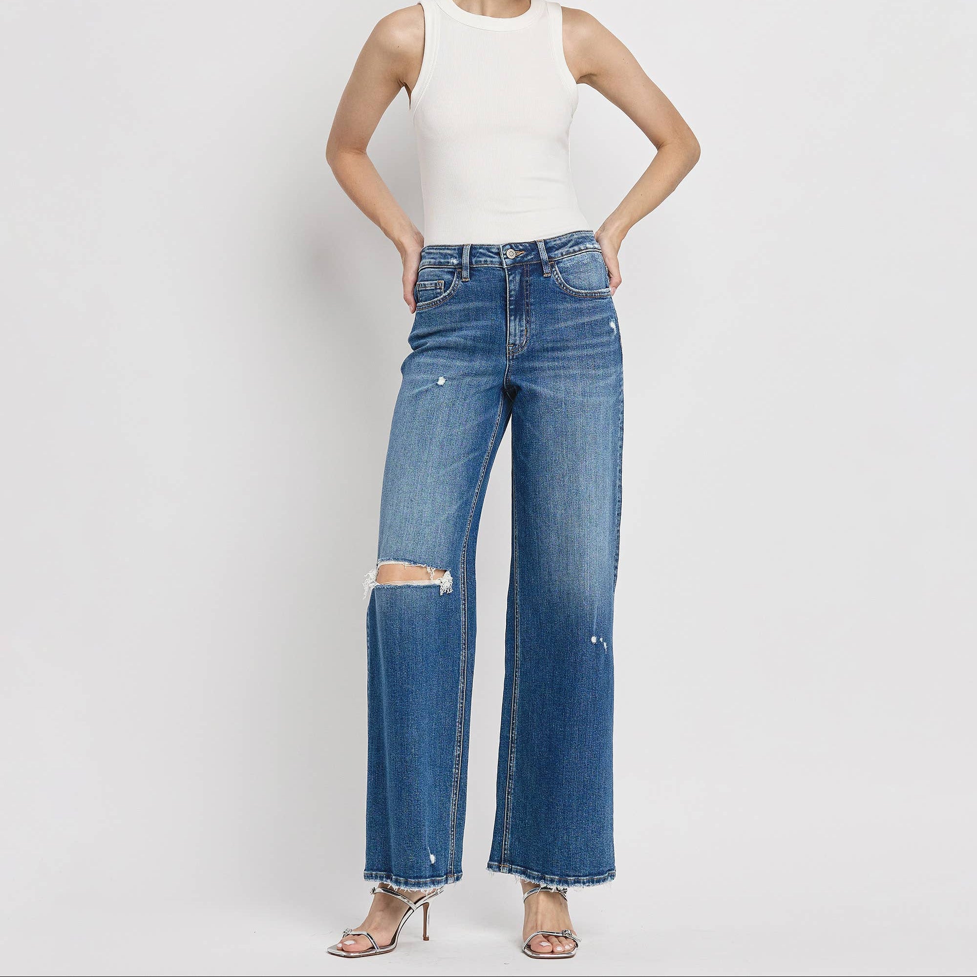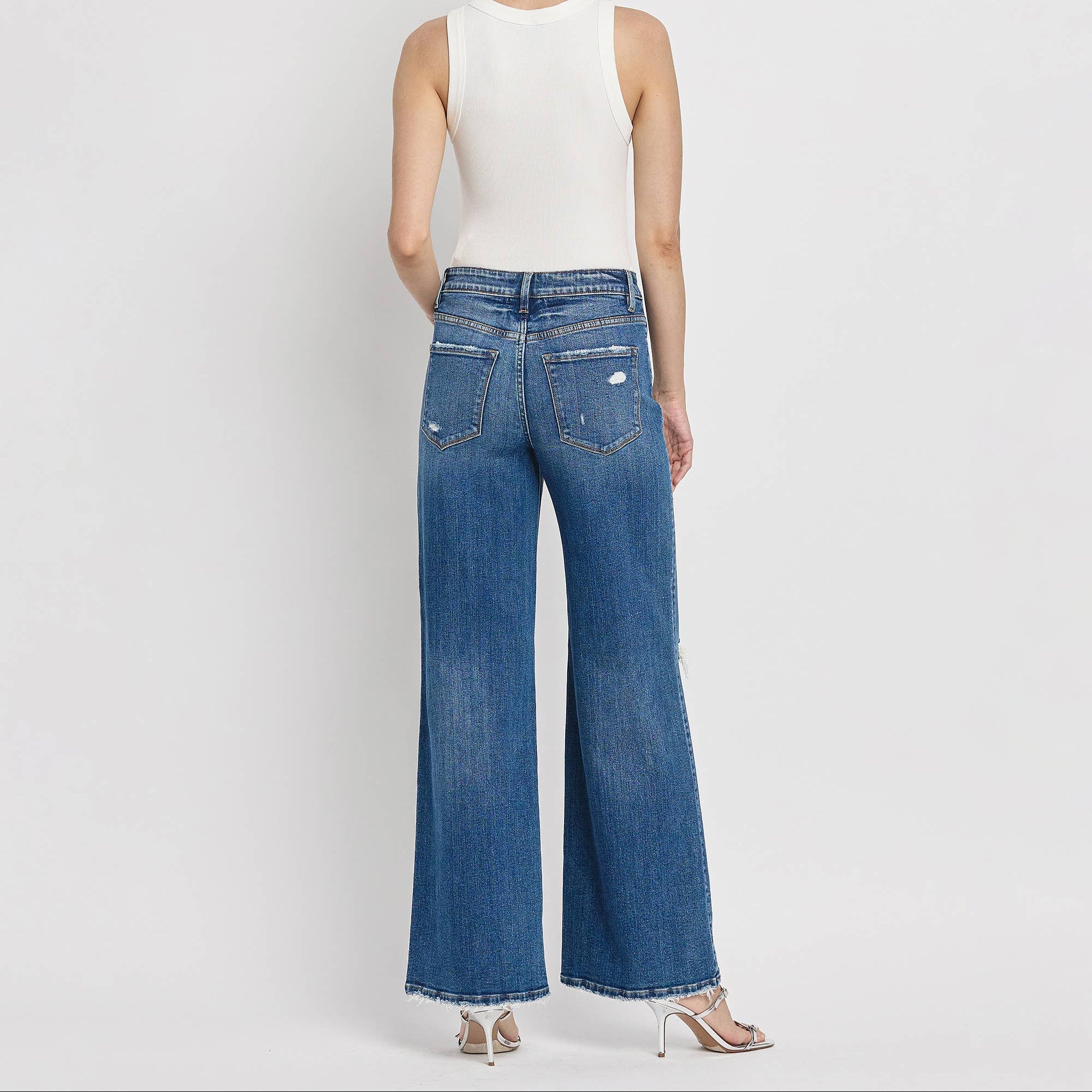COMFORT STRETCH DENIM, HIGH RISE WAIST, DISTRESSED DETAIL, FULL LENGTH, WIDE LEG JEANS F. RISE: 10" / INSEAM: 32" / LEG OPENING: 23" MODEL IS 5'9" WEARING SIZE 26