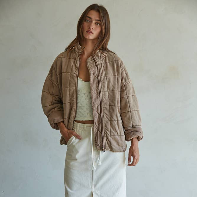A perfect blend of preppy aesthetics and contemporary fit. This long sleeve quilted knit jacket, crafted from 85% cotton and 15% polyester, offers comfort for everyday wear. Its mineral wash adds a unique touch to your wardrobe. Follow care instructions for longevity - hand wash or delicate cycle/hang to dry only. Experience the luxury of ready-to-wear fashion with By Together, tailored specifically for women's everyday lifestyle.
