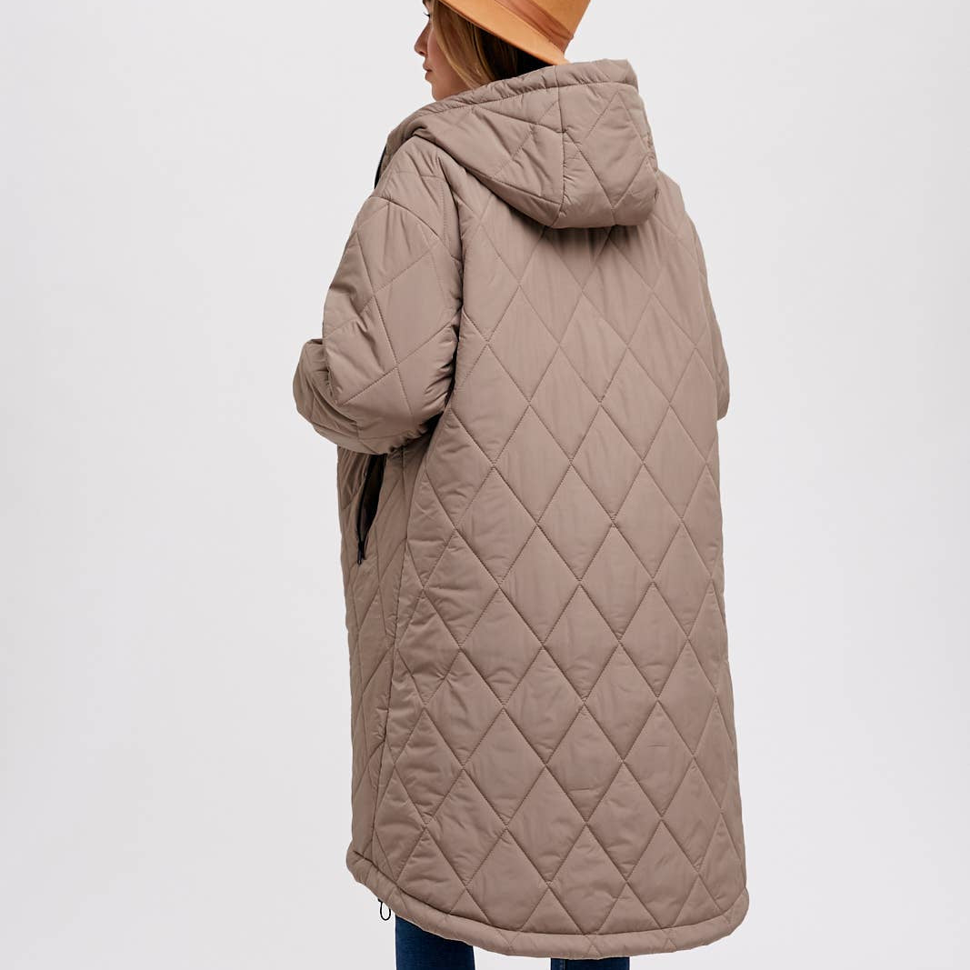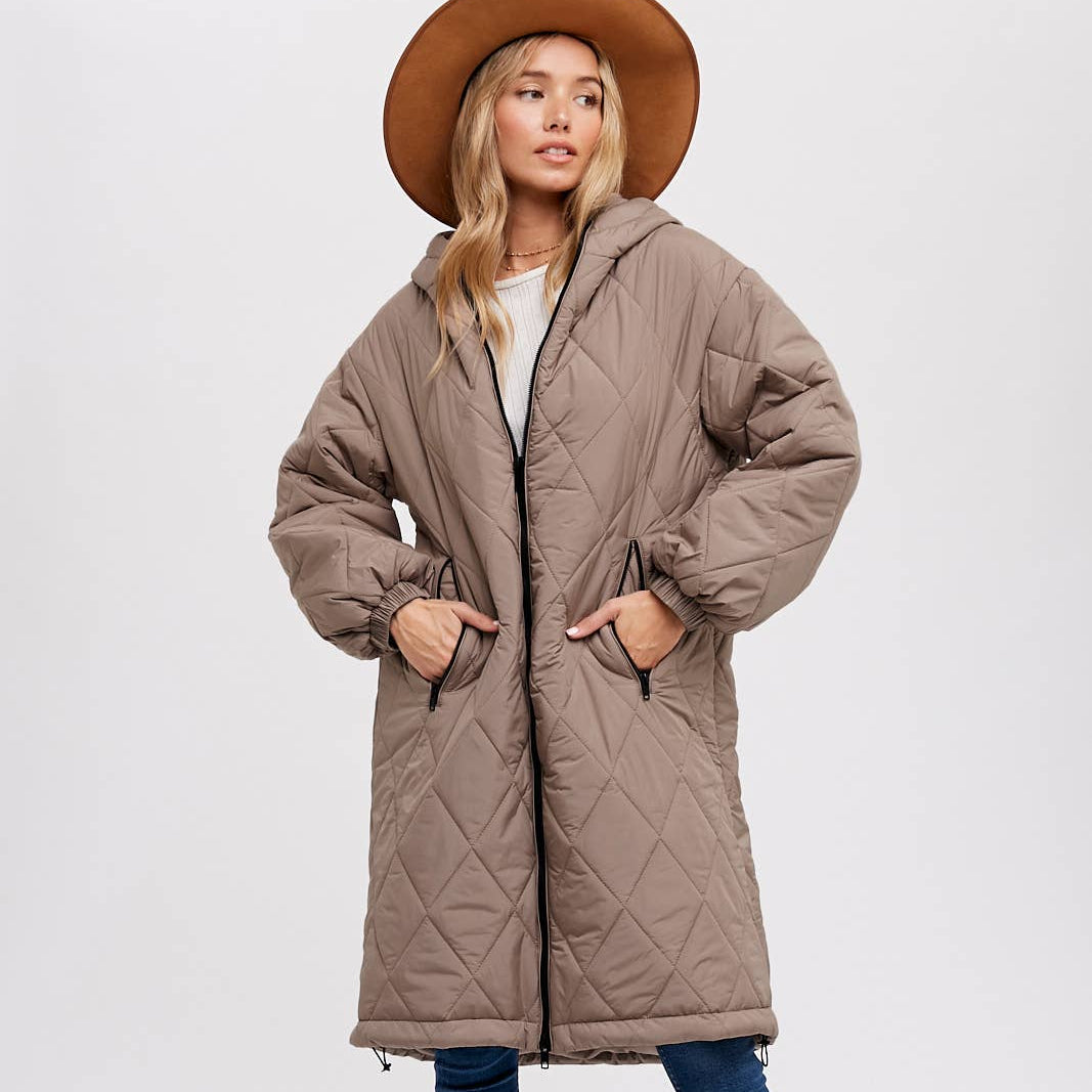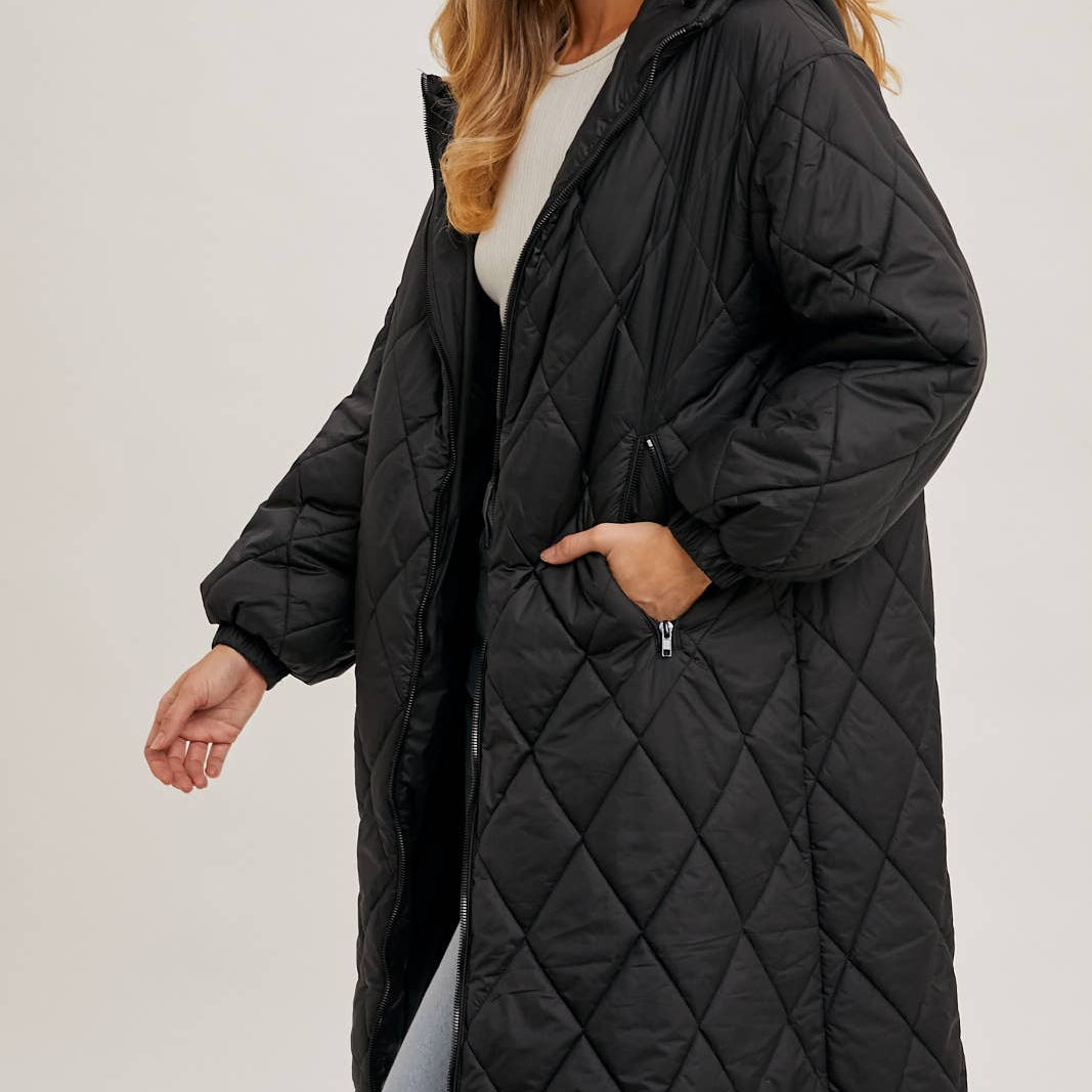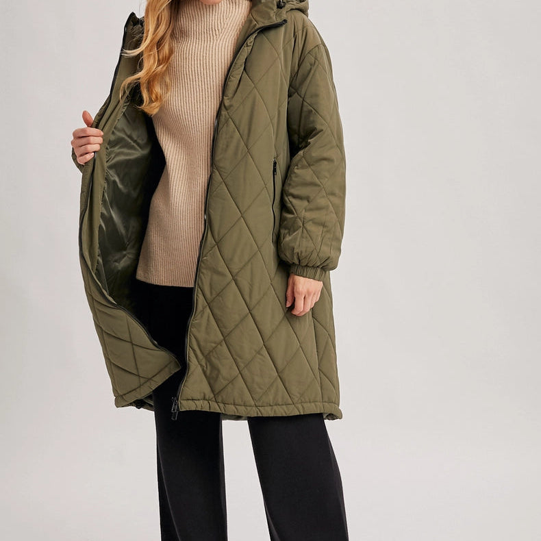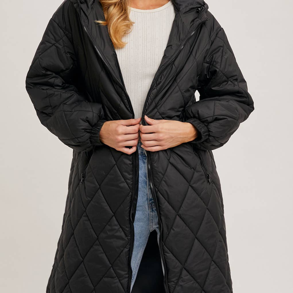 Introducing a trendy and functional longline quilted puffer jacket with a hoodie, zipper front, and lightweight woven outerwear. This jacket combines style with practicality, making it a versatile addition to your wardrobe. The quilted design not only adds visual texture but also provides insulation and warmth during cooler weather.