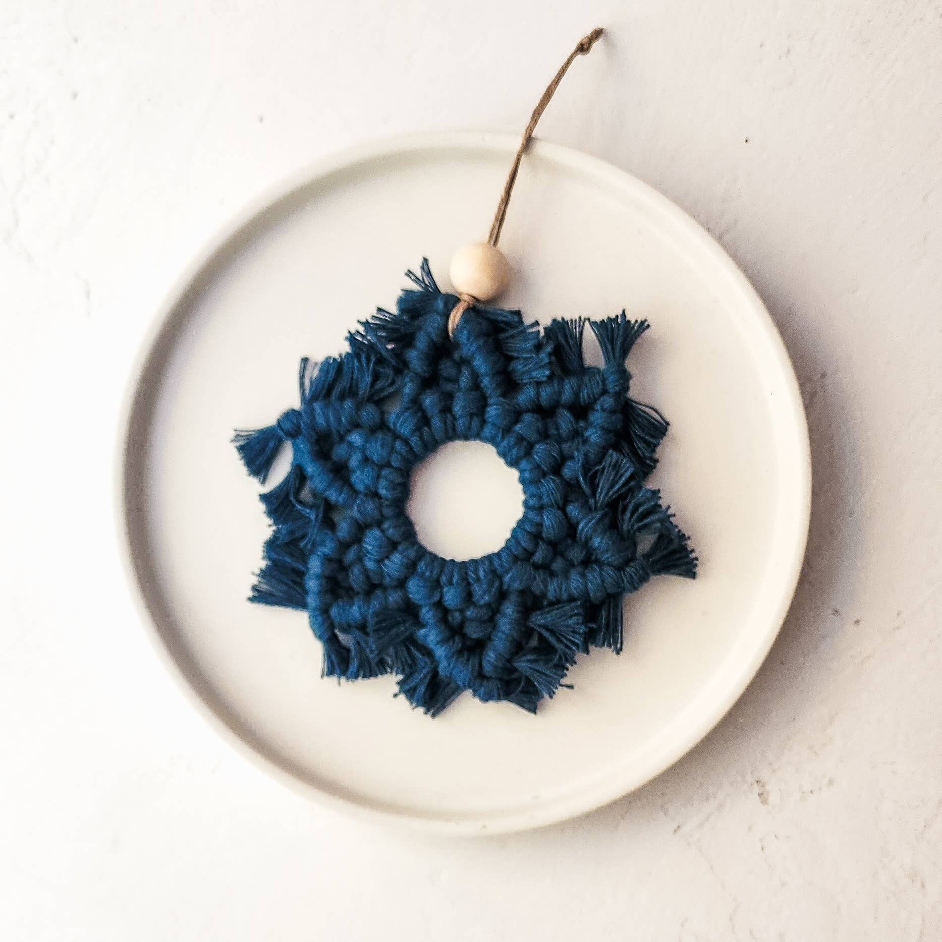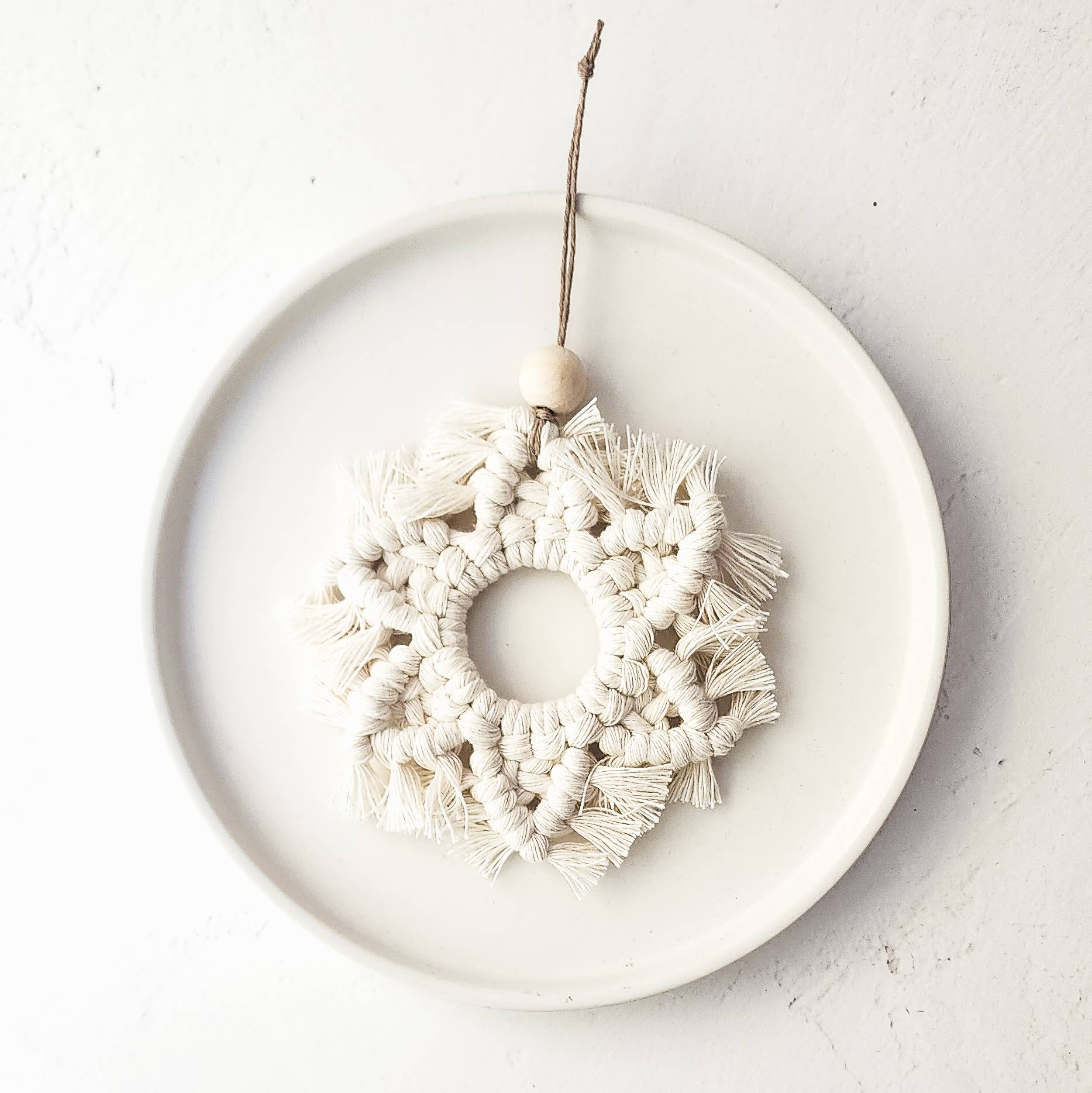 An ornament and a diffuser! Macrame diffuser snowflakes are used as ornaments, gift tags, wine bottle bags, wall decor, and more. They are a timeless beauty that we love to bring out for our customers every year! Add essential oils to the wooden bead to diffuse - such a bonus making them functional art! Each snowflake is roughly 5" and has an attached ~4" burlap string for hanging. They are made from 100% cotton and are wrapped around a metal ring. Notes: These snowflakes come as shown without packaging. *Each snowflake is handmade and there may be a slight variation in design and length.
