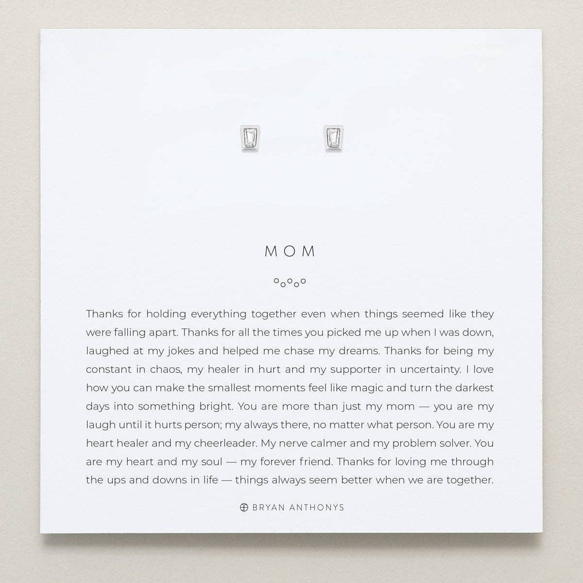 "Thanks for holding everything together even when things seemed like they were falling apart. Thanks for all the times you picked me up when I was down, laughed at my jokes and helped me chase my dreams. Thanks for being my constant in chaos, my healer in hurt and my supporter in uncertainty. I love how you can make the smallest moments feel like magic and turn the darkest days into something bright. You are more than just my mom — you are my laugh until it hurts person; my always there, no matter what person. You are my heart healer and my cheerleader. My nerve calmer and my problem solver. You are my heart and my soul — my forever friend. Thanks for loving me through the ups and downs in life — things always seem better when we are together." Designed by Bryan Anthonys Base Material: Brass, CZs Dimensions: 4.5 x 3.5 mm Available Finishes: 14k Gold (nickel-free), Silver (nickel-free)
