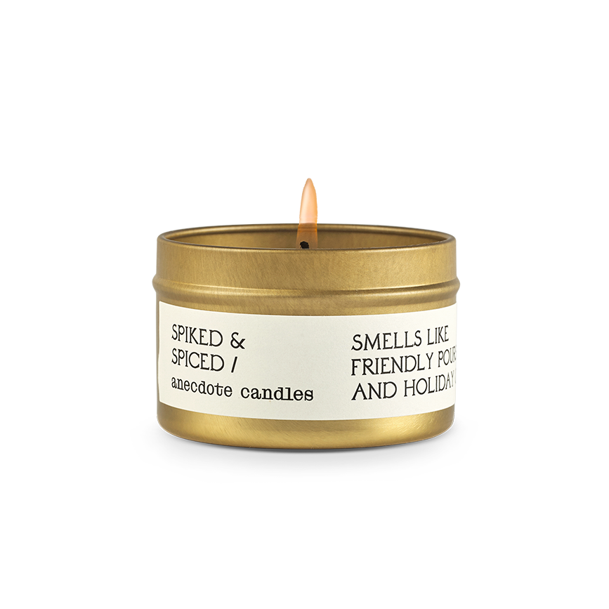 The perfect gift this season! Reads "Smells like friendly pours and holiday cheer" A modern take on a holiday classic, Spiked & Spiced evokes the festive spirit of mulled wine. A warm and inviting blend of orange, cinnamon, and red currant floats above a deep base of red wine and cedarwood. Additional information: Made with coconut-soy wax, cotton core wicks, and phthalate-free fragrance oils. Travel tins are 3.4 oz and have a burn time of 20 - 25 hours.