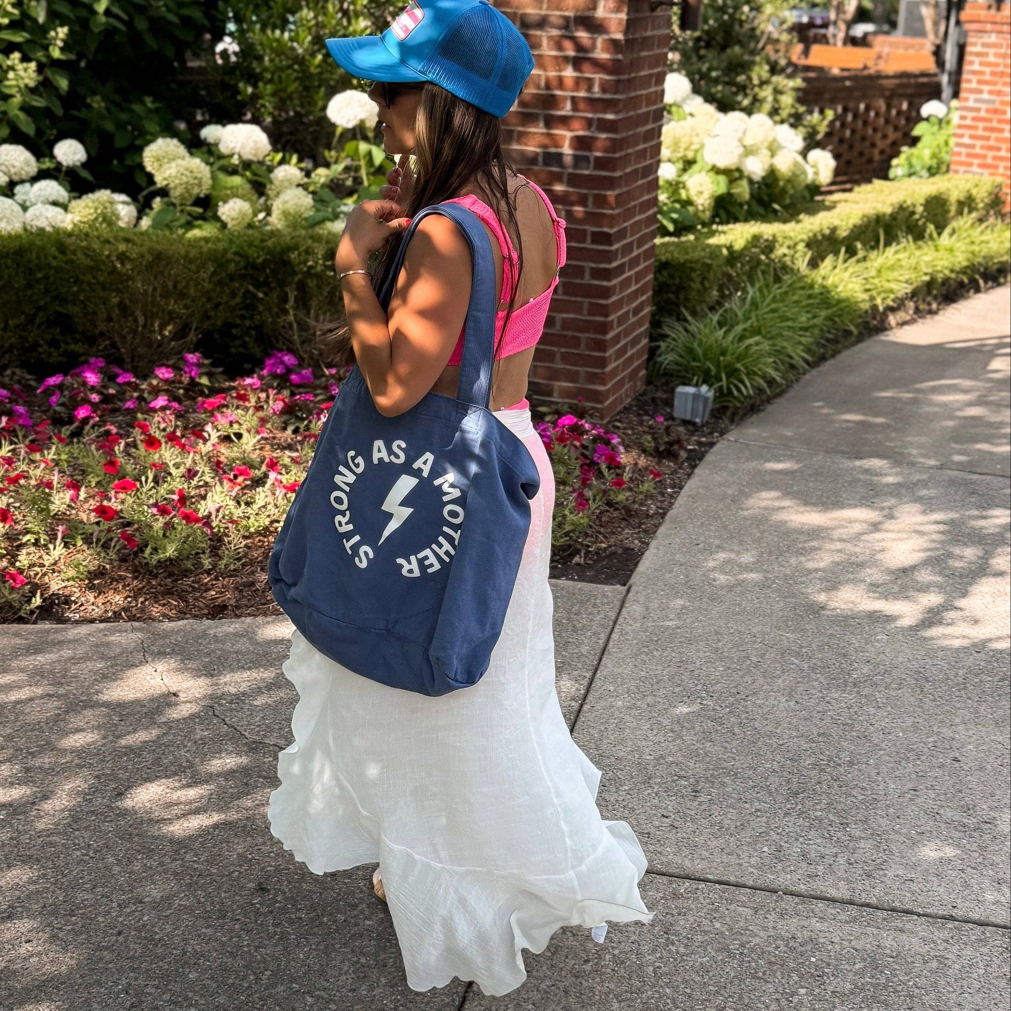 Oversized to fit all the diapers, water bottles, and snacks for a day full of errands! Thick and durable, made of 100% cotton twill fabric. Features: * Color: Blue * Bag Dimensions: 26in x 15in * 100% Cotton Twill, 12oz * Strong as a mother™ logo printed on the front in white * 2 Inside pockets. We donate 10% of our proceeds to charitable organizations supporting mothers in need.