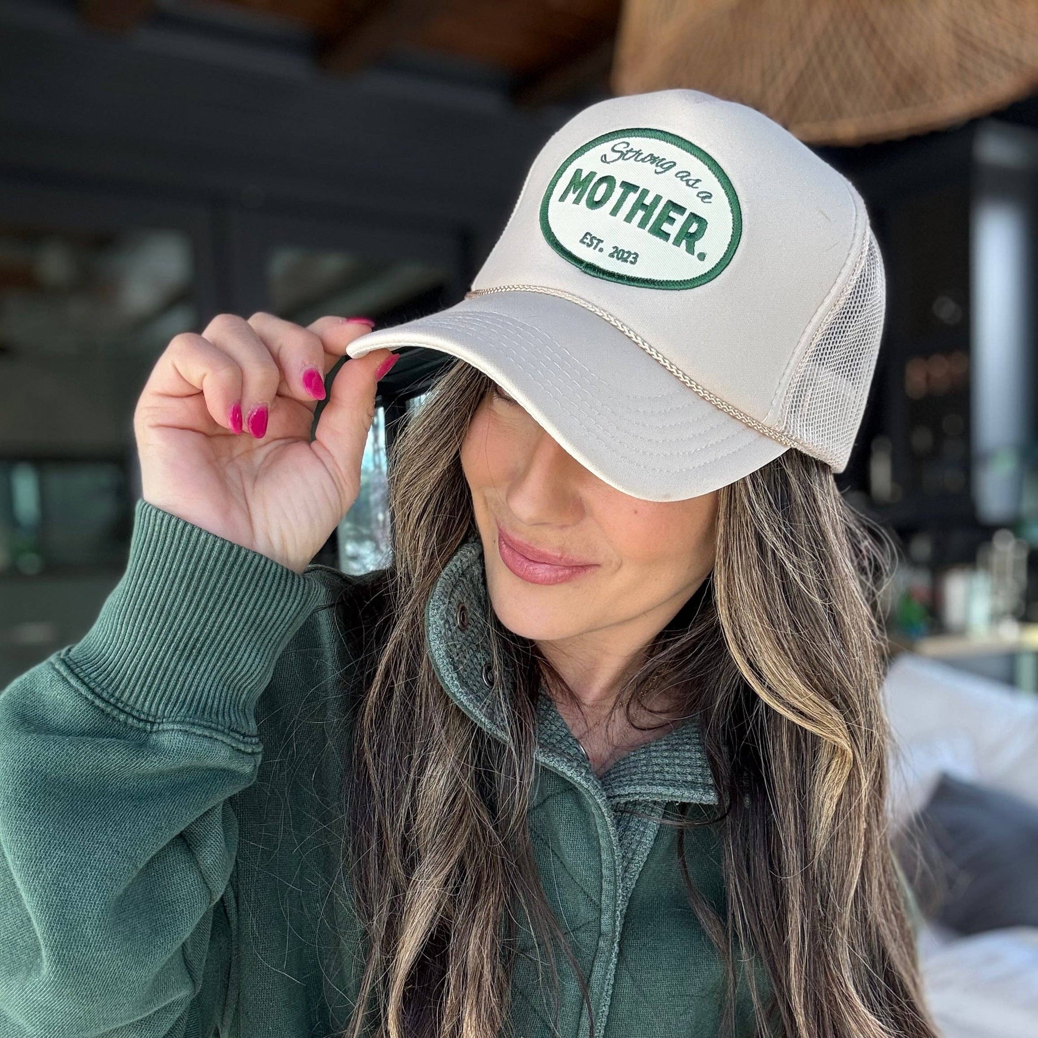 Introducing the VINTAGE Mother. patch hat. Vintage vibes inspired by your grandpa's old hat. Wear as a daily reminder of your strength. Features: * High profile, structured * Color: Sand * Retro patch is hand stitched onto the front of hat * Slightly curved visor * Foam trucker with nylon mesh back * Plastic snapback. We donate 10% of our proceeds to charitable organizations supporting mothers in need.
